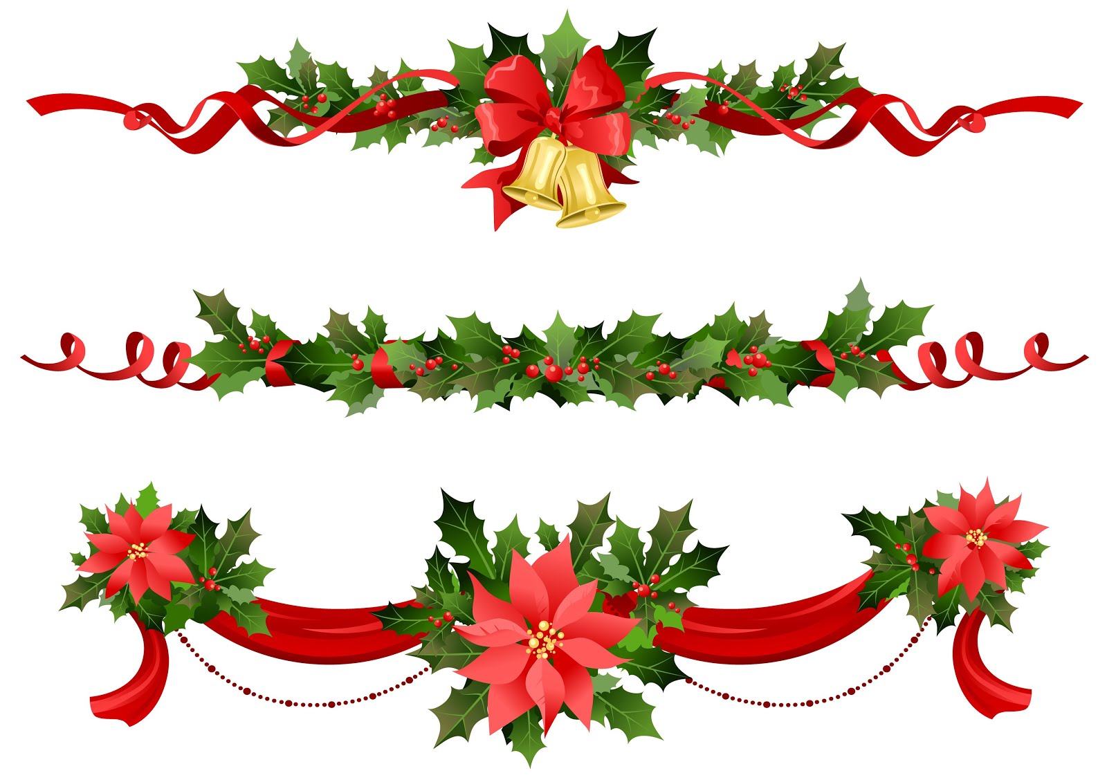 Esta imagen navideña esta con un fondo blanco, hay tres filas con adornos y guirnaldas para la decoración en Navidad, hay flores y cintas, Descárgala gratis