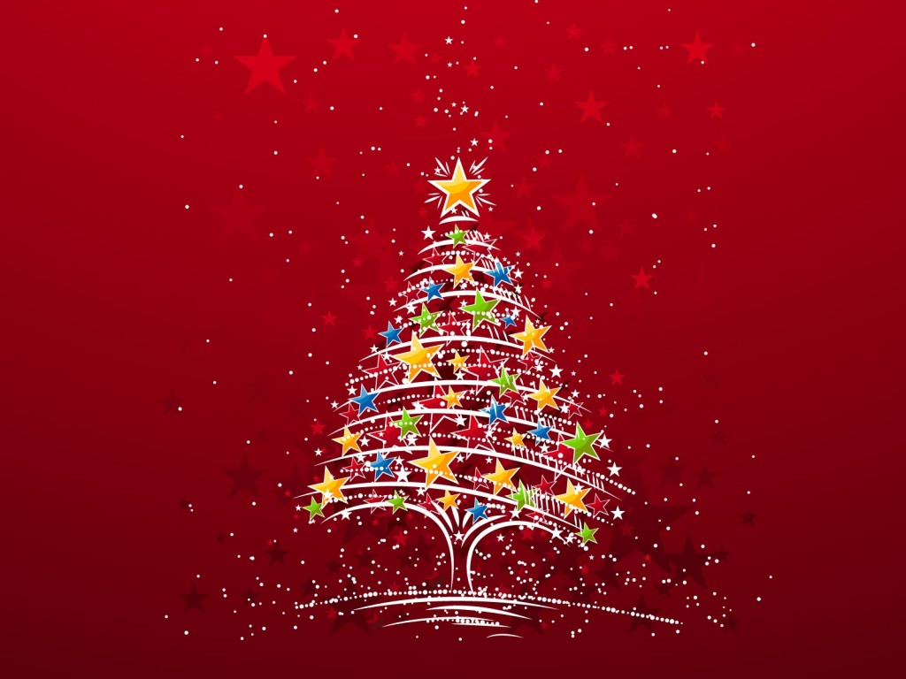 Este fondo rojo nos presenta un árbol de navidad hecho con estrellas, predominan las estrellas color azul, rojo y dorado, hay nieve cayendo sobre él