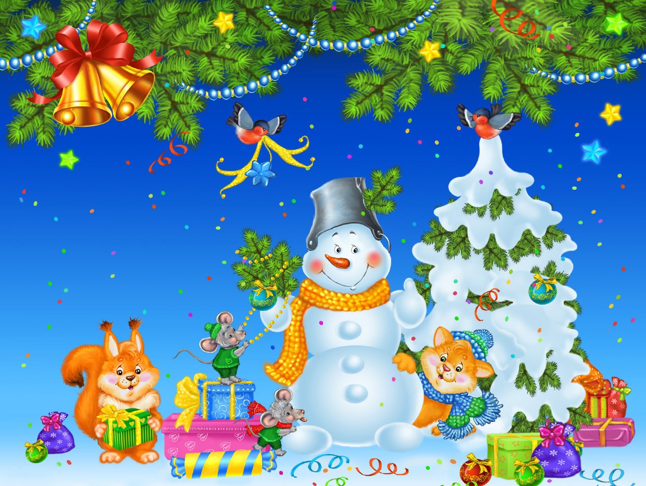 En esta imagen vemos el fondo celeste con estrellas, sus bordes están decorados con campanas y hojas, se ve un muñeco de nieve con bufanda junto a 2 ardillas con regalos