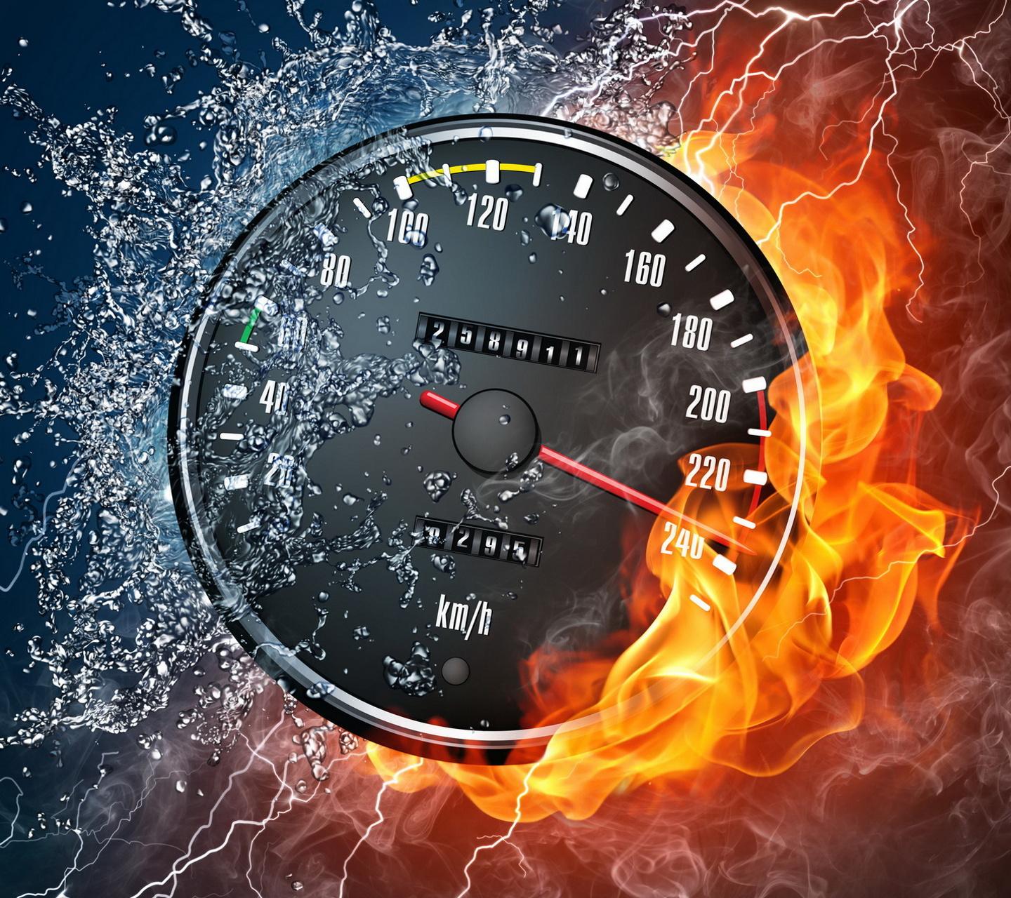 Break The Speed en esta imagen podemos ver un velocímetro cayendo al fondo que está divido de un lado agua y el otro lado fuego, está en muy buena resolución