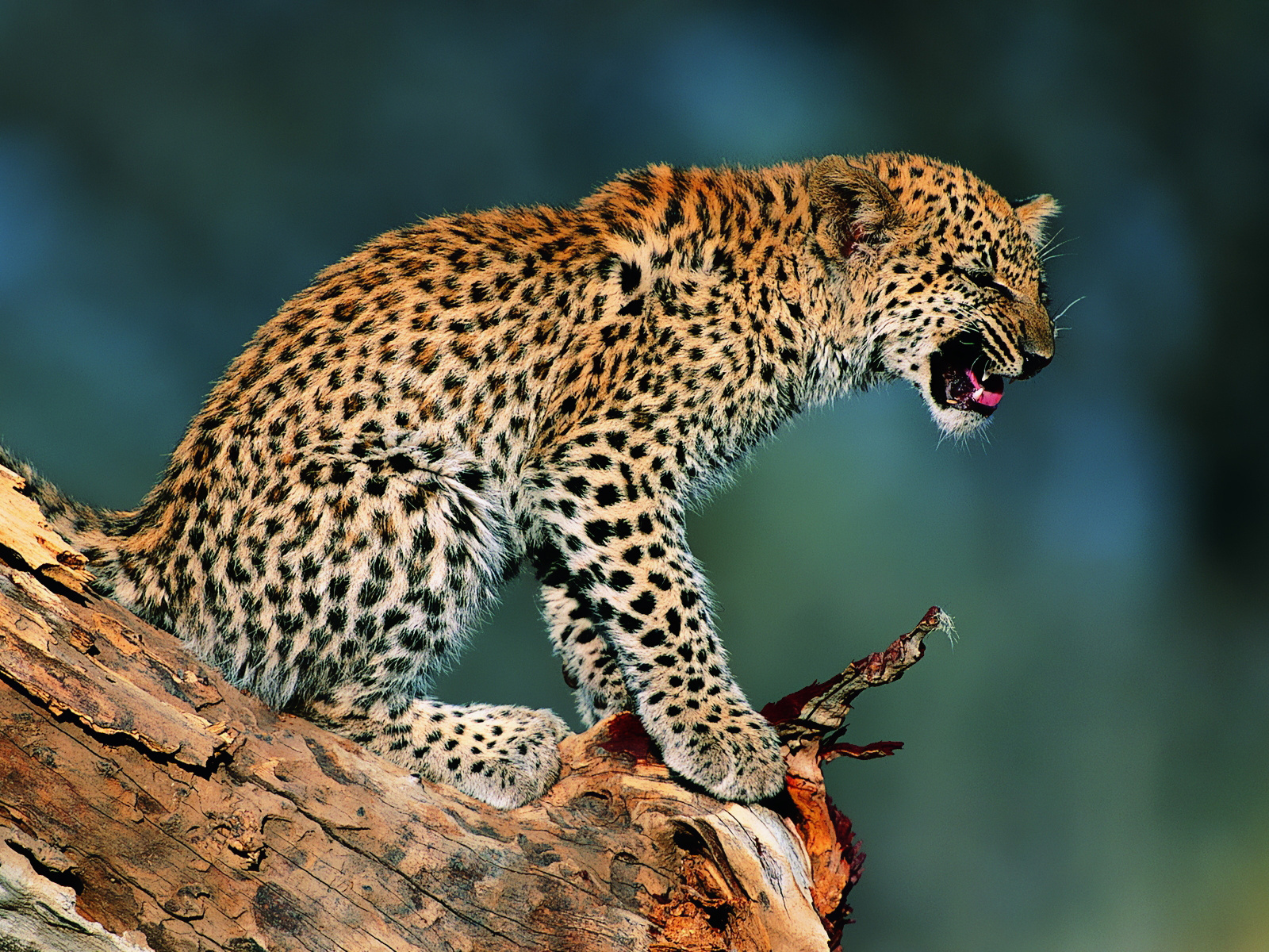 Esta impresionante imagen captura un momento de la naturaleza en su máxima expresión, ideal para usar como fondo de pantalla. En el centro de la escena vemos a un joven leopardo encaramado sobre un resistente tronco de árbol. El leopardo, con su característico pelaje moteado de manchas negras sobre fondo dorado, muestra una expresión de alerta, como si estuviera observando su entorno con gran atención. Este tipo de imagen es perfecta para aquellos que buscan transmitir la belleza y la fuerza de la fauna salvaje en sus dispositivos. El contraste entre el leopardo y el tronco de madera añade un elemento visual poderoso, subrayando la naturaleza indomable de este majestuoso felino. La textura del pelaje del leopardo, con sus manchas perfectamente definidas, resalta con gran nitidez, haciendo que el animal destaque sobre el fondo desenfocado, que sugiere un paisaje natural de colores verdes y azules suaves. Esta composición invita a la contemplación, permitiendo una conexión íntima con la naturaleza salvaje. Elegir esta imagen como wallpaper no solo embellecerá la pantalla de tu dispositivo, sino que también traerá un sentido de aventura y salir de la rutina diaria. Su calidad visual y su temática de aventura la convierten en una elección amplia para cualquier amante de la naturaleza. Ya sea en una computadora de escritorio, laptop o dispositivo móvil, este fondo de pantalla de leopardo es una opción espectacular para quienes buscan destacar visualmente. Con esta imagen, cada vistazo a tu pantalla te transportará al corazón de la naturaleza salvaje.