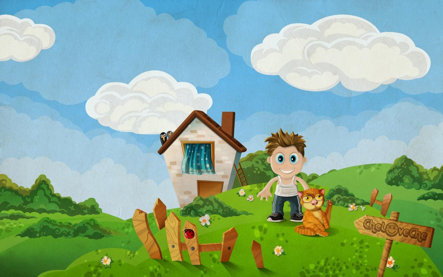 Cartoon En esta imagen podemos observar un fondo de cartoon donde hay un paisaje con nubes, pequeñas colinas una casa chiquita con cerca y un niño acompañado de su mascota