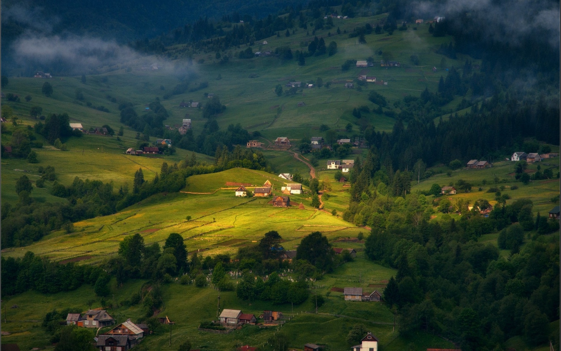 En esta imagen podemos apreciar un hermosa paisaje de colinas verdes, rodeada de casas y arboles grandes junto a pinos, la vista es hermosa y es ideal para fondo de pantalla