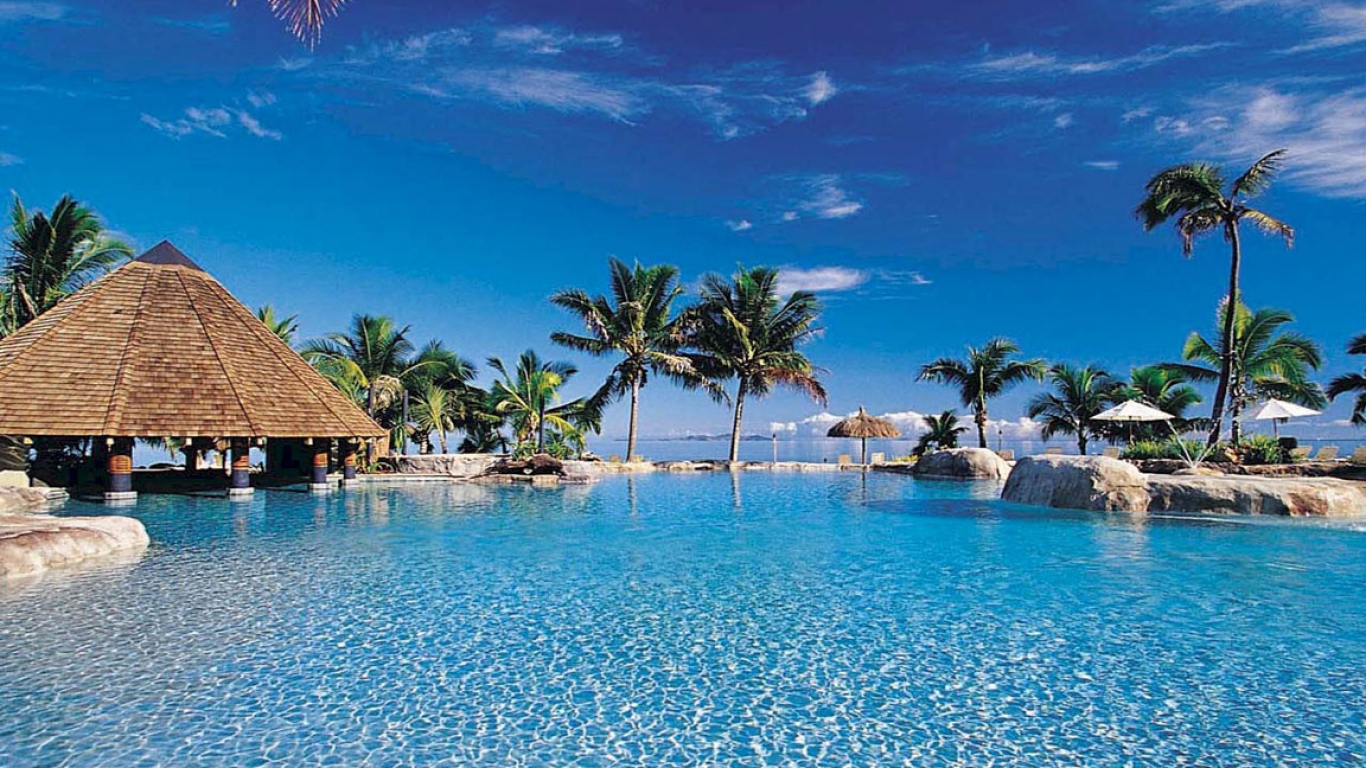 Esta imagen describe un verdadero paraíso, es Decamerom en el horizonte se ve un río y dentro del hotel una piscina su agua es celeste, se ven palmeras y sombrillas