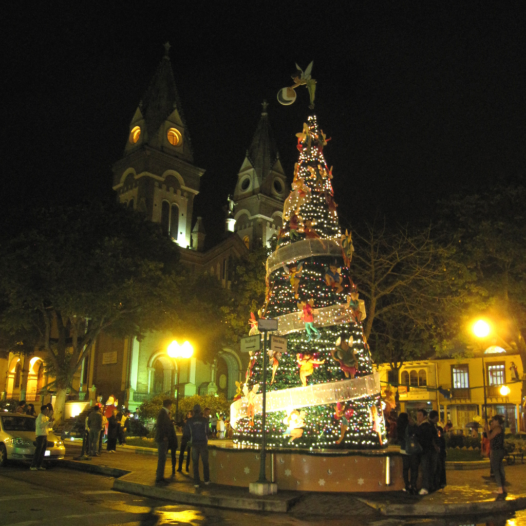 En esta imagen vemos una iglesia que a su alrededor tiene un parque y árboles, hay un árbol de navidad con una cinta gruesa que cruza y varios muñecos de felpa colgado