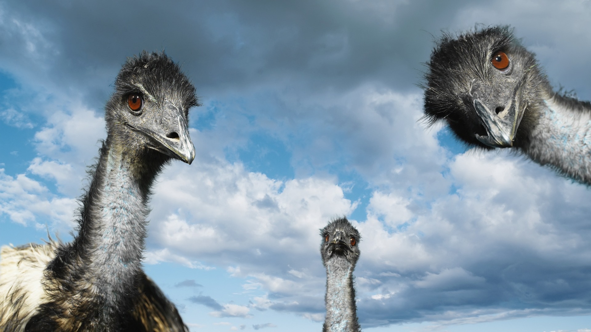 En este fondo de pantalla podemos ver un lindo cielo cubierto de nubes, y se ven las cabezas de las avestruz que son de color gris y sus ojos de color café