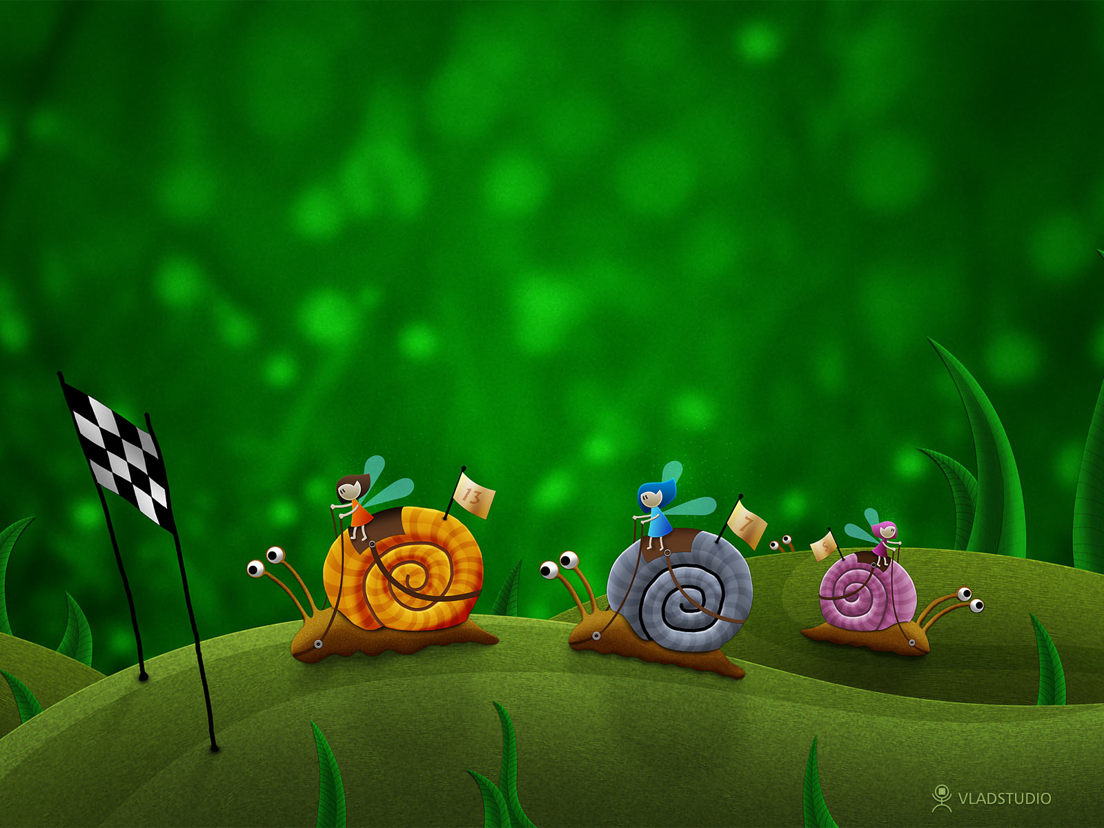 En esta imagen podemos observar un fondo verde difuminado, y unos lindos caracoles animados en una competencia, encima de ellas van unas muñequitas con alas