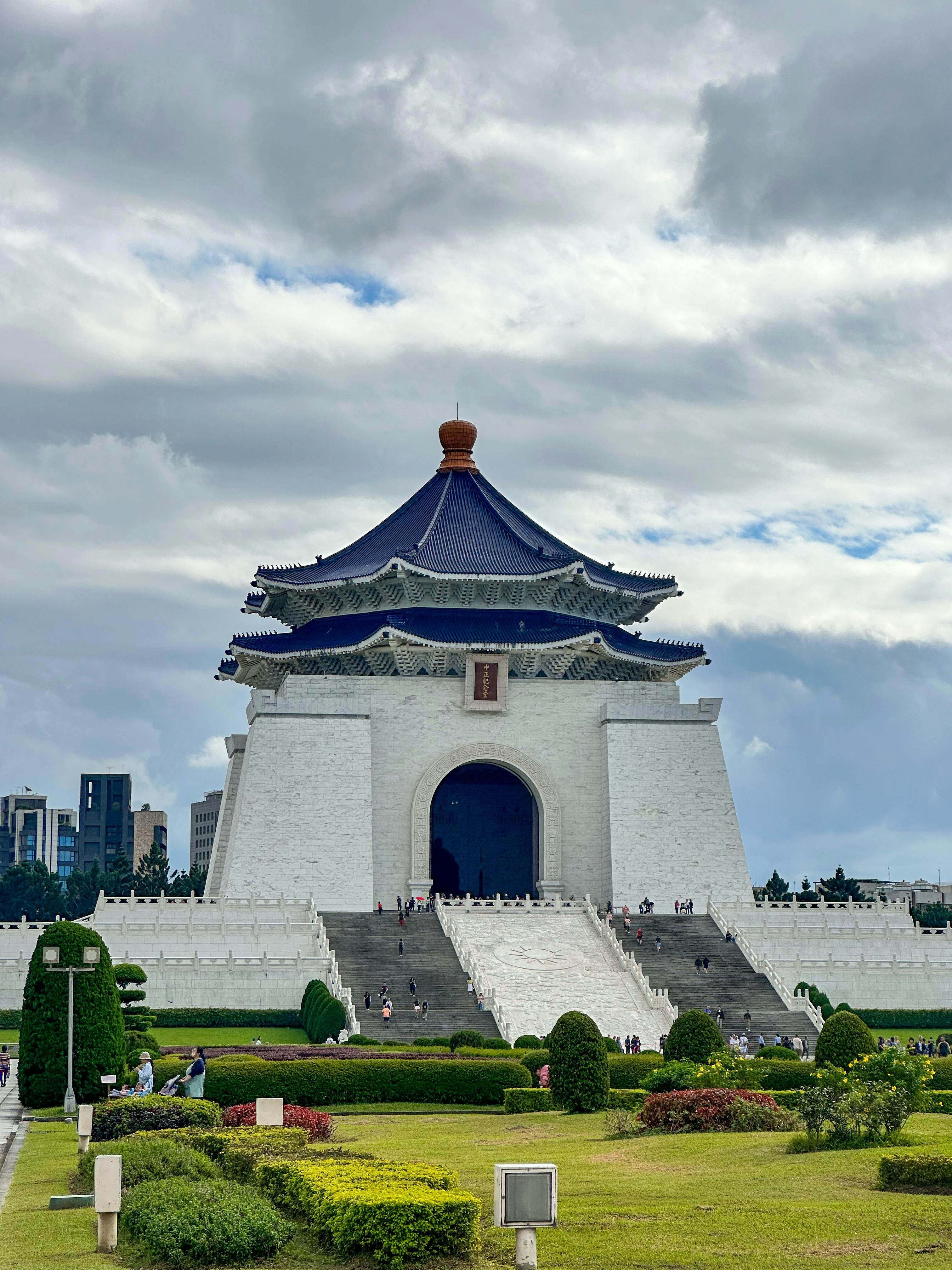 La imagen muestra un majestuoso monumento arquitectónico, caracterizado por su gran escalinata y un impresionante techo azul en forma de pagoda. Este edificio, que parece estar hecho de piedra blanca, se alza en un amplio espacio verde, donde se aprecian bien cuidados jardines y arbustos recortados. El cielo está cubierto de nubes, lo que añade un aire dramático a la escena. Muchas personas caminan por las escaleras y en el área circundante, lo que indica la popularidad del lugar. Este sitio, sin duda, es un importante punto turístico que refleja la rica herencia cultural y arquitectónica de su entorno.