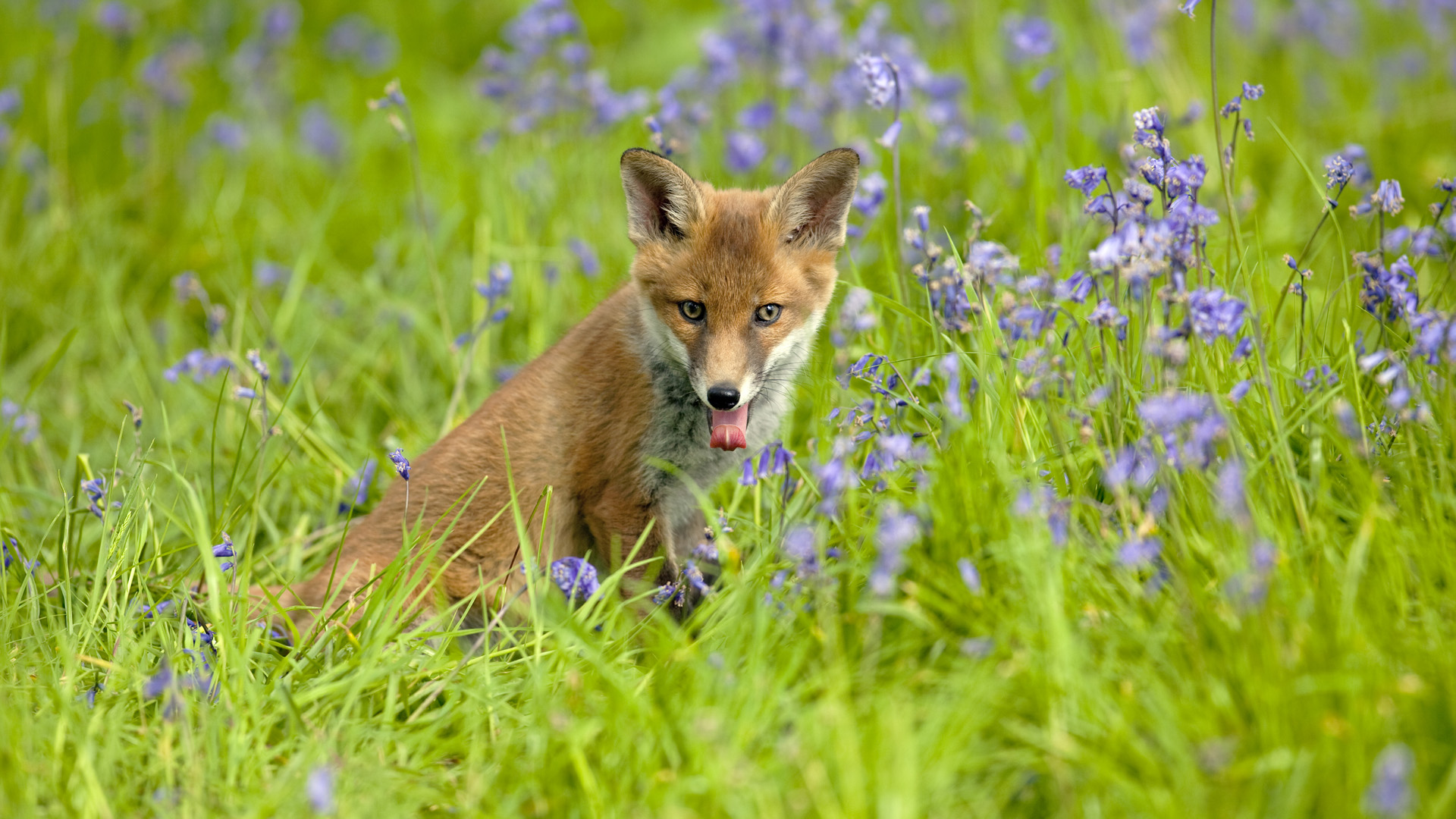 En esta imagen podemos ver un campo verde con pequeñas flores color lila, y en medio se ve un zorro con la lengua afuera atento, sus ojos son verdes