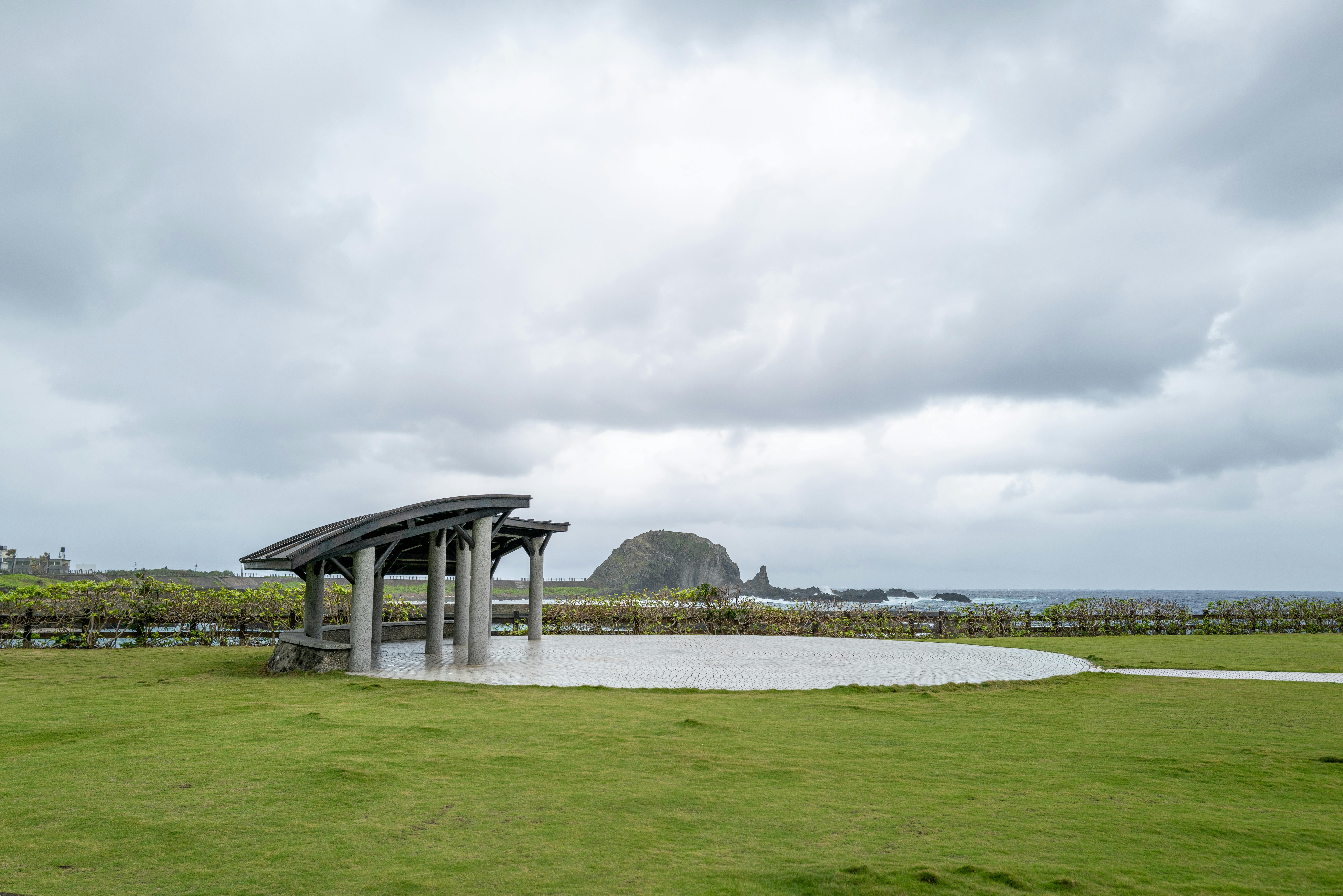 La imagen presenta un paisaje sereno, donde se destaca una estructura arquitectónica moderna que parece ser un mirador o un área de descanso. Su diseño, con un techo curvado y soportes de columnas, se integra armoniosamente con el entorno natural. Al fondo, se aprecian formaciones rocosas que emergen del mar, bajo un cielo nublado que aporta una atmósfera tranquila. La vegetación verde que rodea la estructura y el piso de piedras complementan la escena, creando un espacio ideal para contemplar la belleza del paisaje costero. La combinación de elementos arquitectónicos y naturales invita a la reflexión y al disfrute del aire libre.