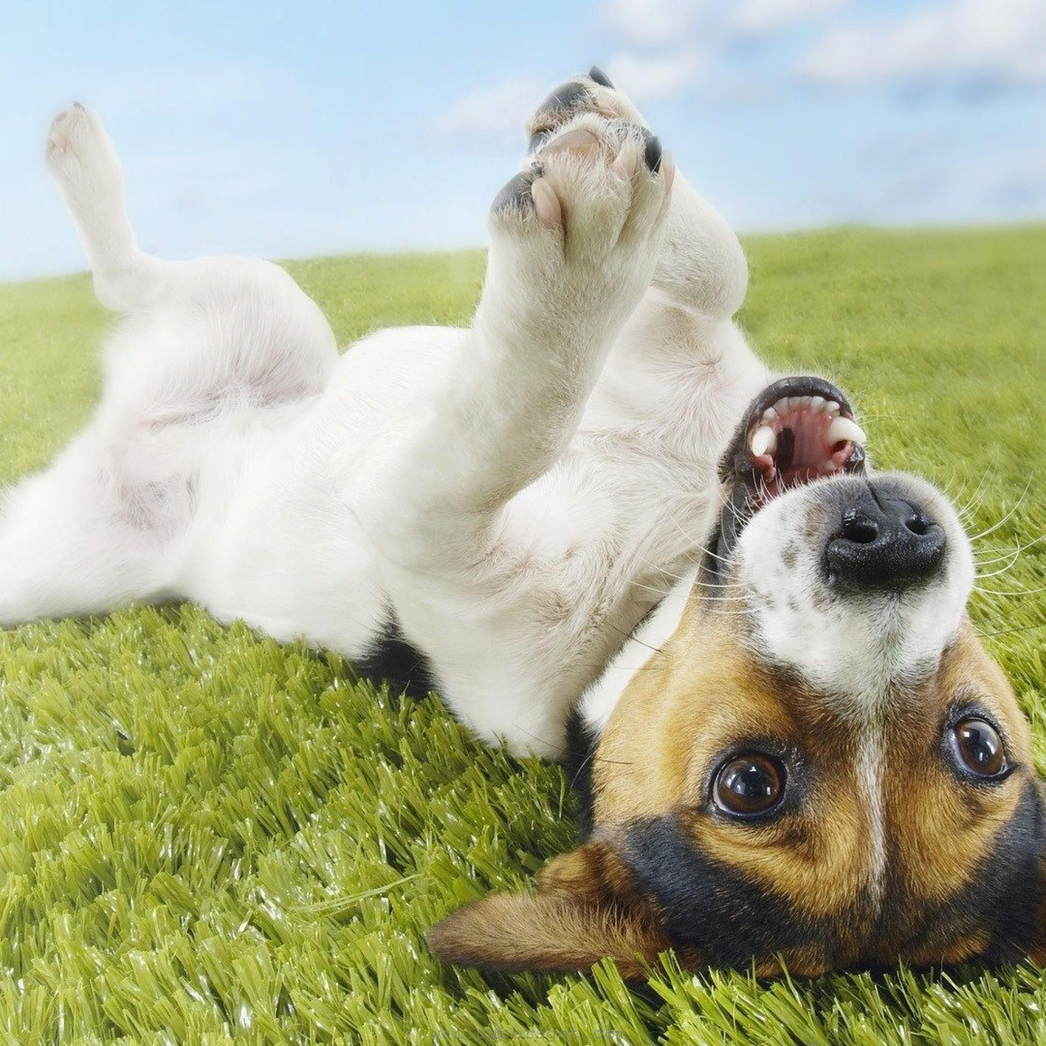 En esta imagen podemos observar un hermoso césped y a un gracioso perro jugando, está patas arriba y es de color blanco con manchas negras y café