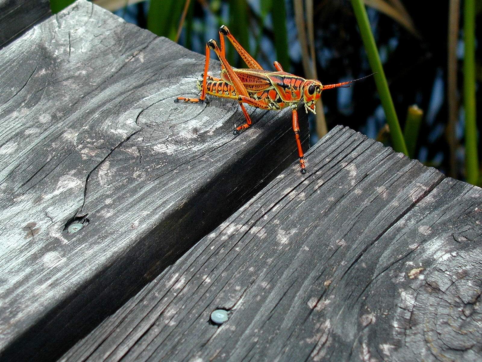 Este hermoso fondo de pantalla es de un lindo saltamonte color naranja con manchas negras, está en un puente de madera y se ve maleza a su alrededor