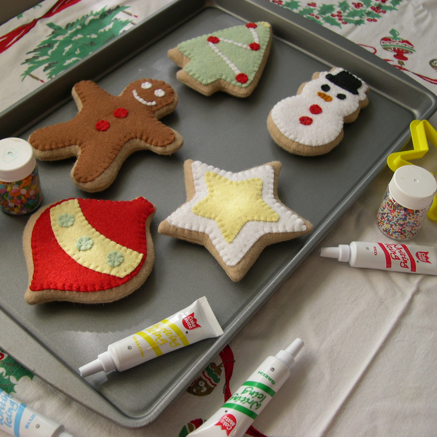 En esta imagen podemos observar una lindas manualidades para adornar un arbolito entre ellos vemos una galleta, muñeco de nieve, estrella y una bola roja