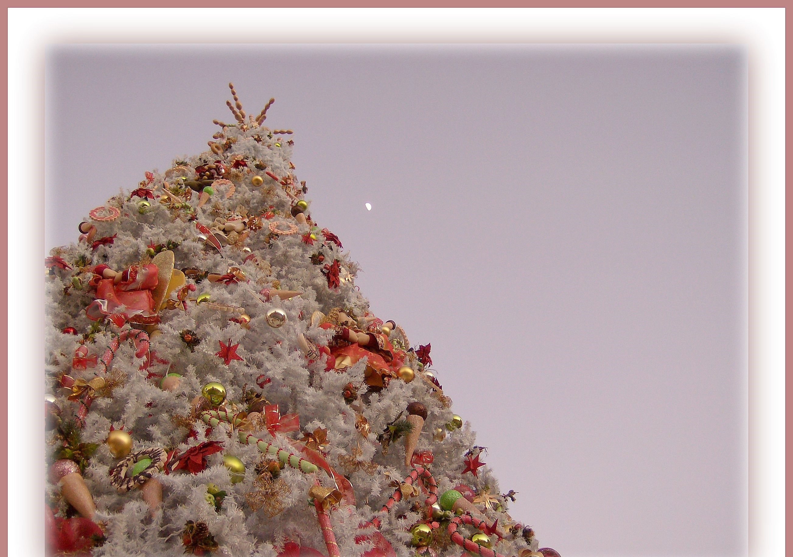 En esta imagen podemos observar un fondo gris con marco y un gigante árbol blanco frondoso lleno de decoraciones como bolitas doradas, plateadas y rojas