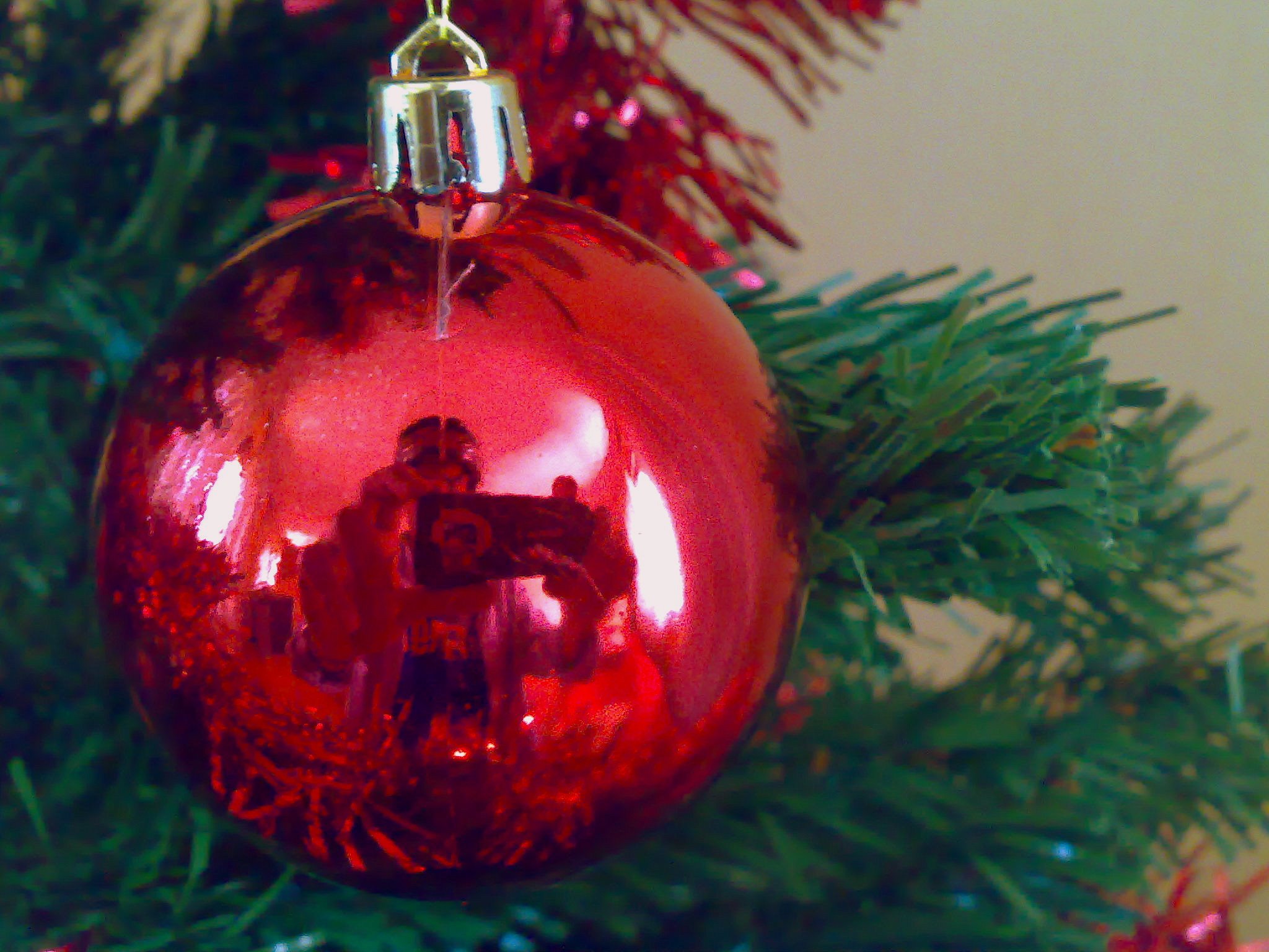 En esta imagen podemos observar las ramas de un arbolito navideño con una bola roja, está en muy buena resolución, descárgala gratis