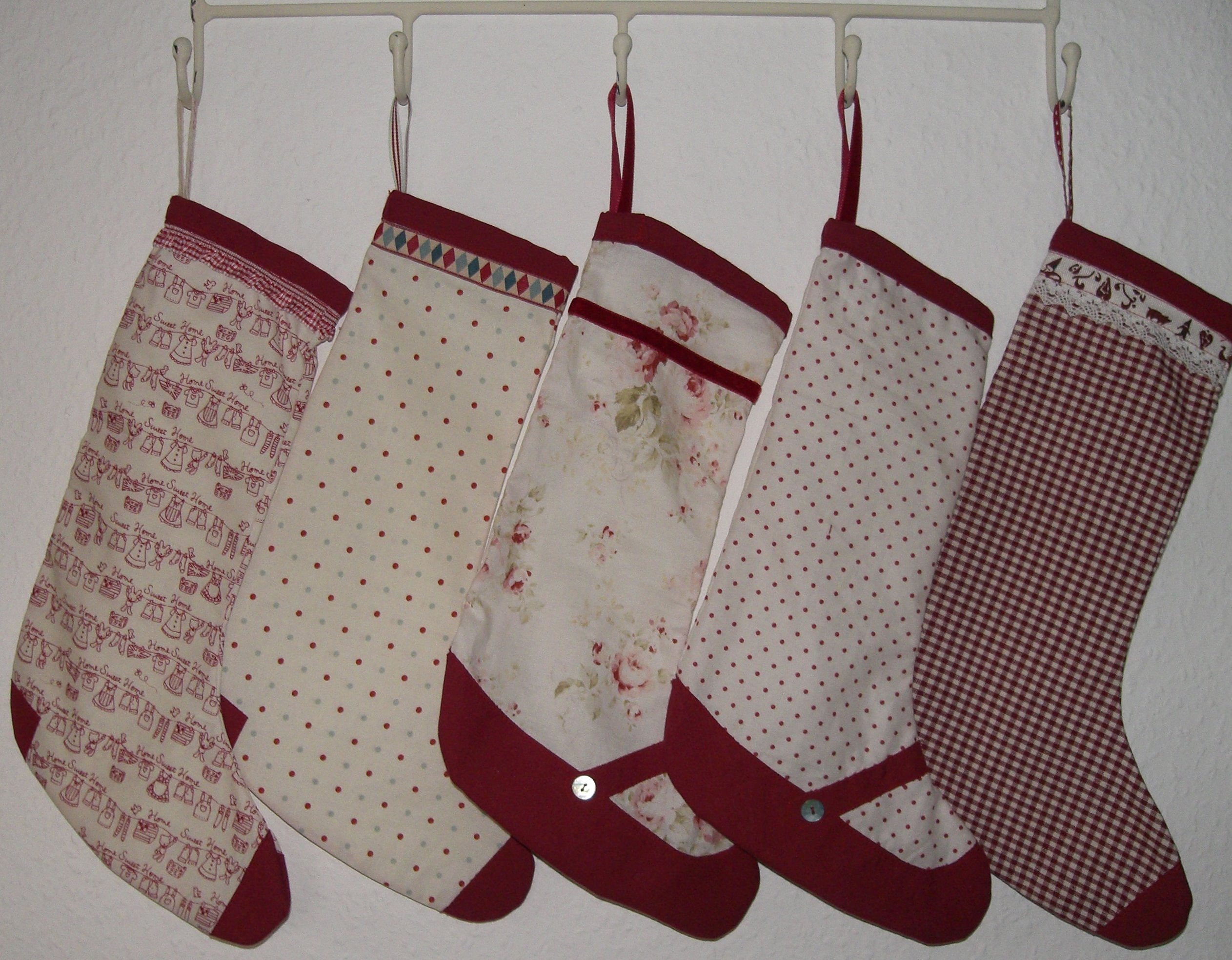 En esta imagen podemos apreciar un fondo blanco y sobre el están colgadas unas botitas navideñas con filos rojos, unas son de cuadros, de flores puntos