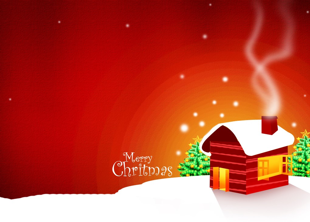 Esta imagen Navideña nos muestra un fondo rojo y en la superficie nieve, se ve una pequeña casa con chimenea y de extremo a extremo se ven 2 arbolitos decorados