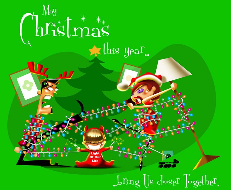 Esta imagen es muy graciosa y tiene un fondo verde y la sombra de un árbol, se ven a los miembros de una familia enredados con los foquitos de navidad