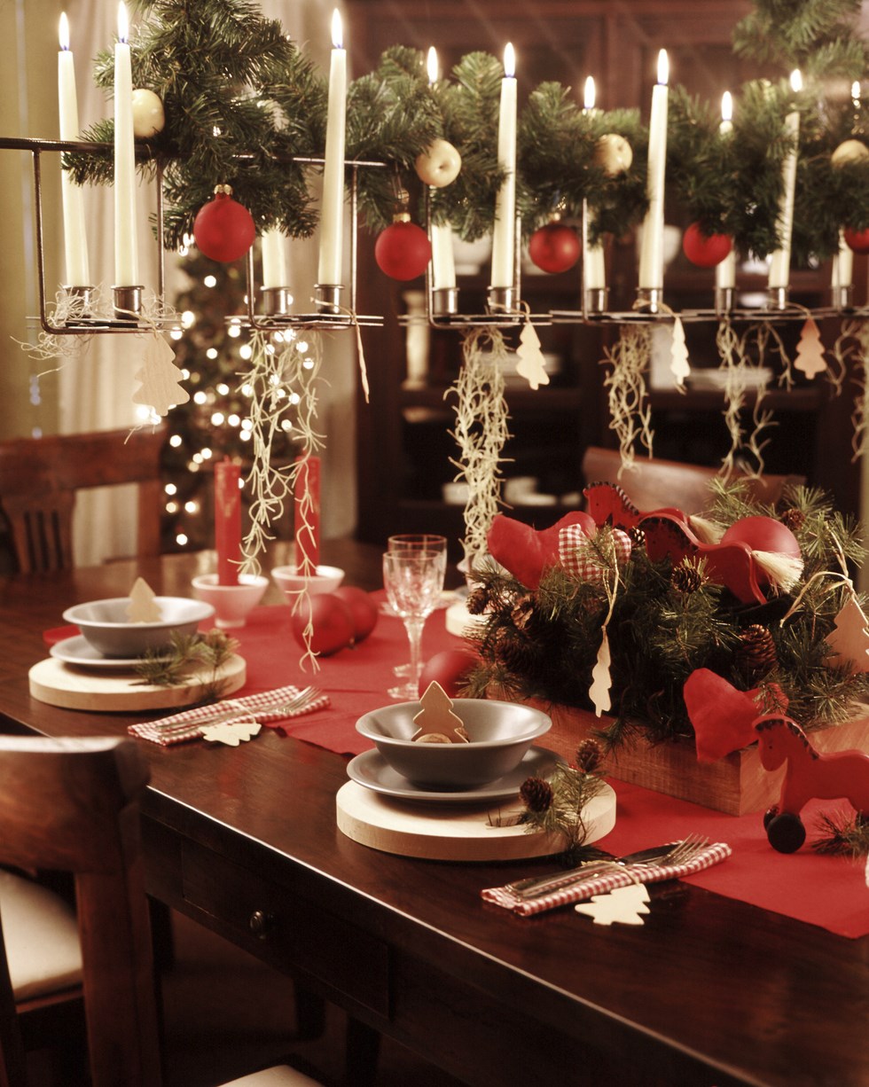 Esta imagen es ideal para decoración de una mesa en Navidad, se ven velas blancas con candelabros y bolas rojas, está la vajilla lista para servir