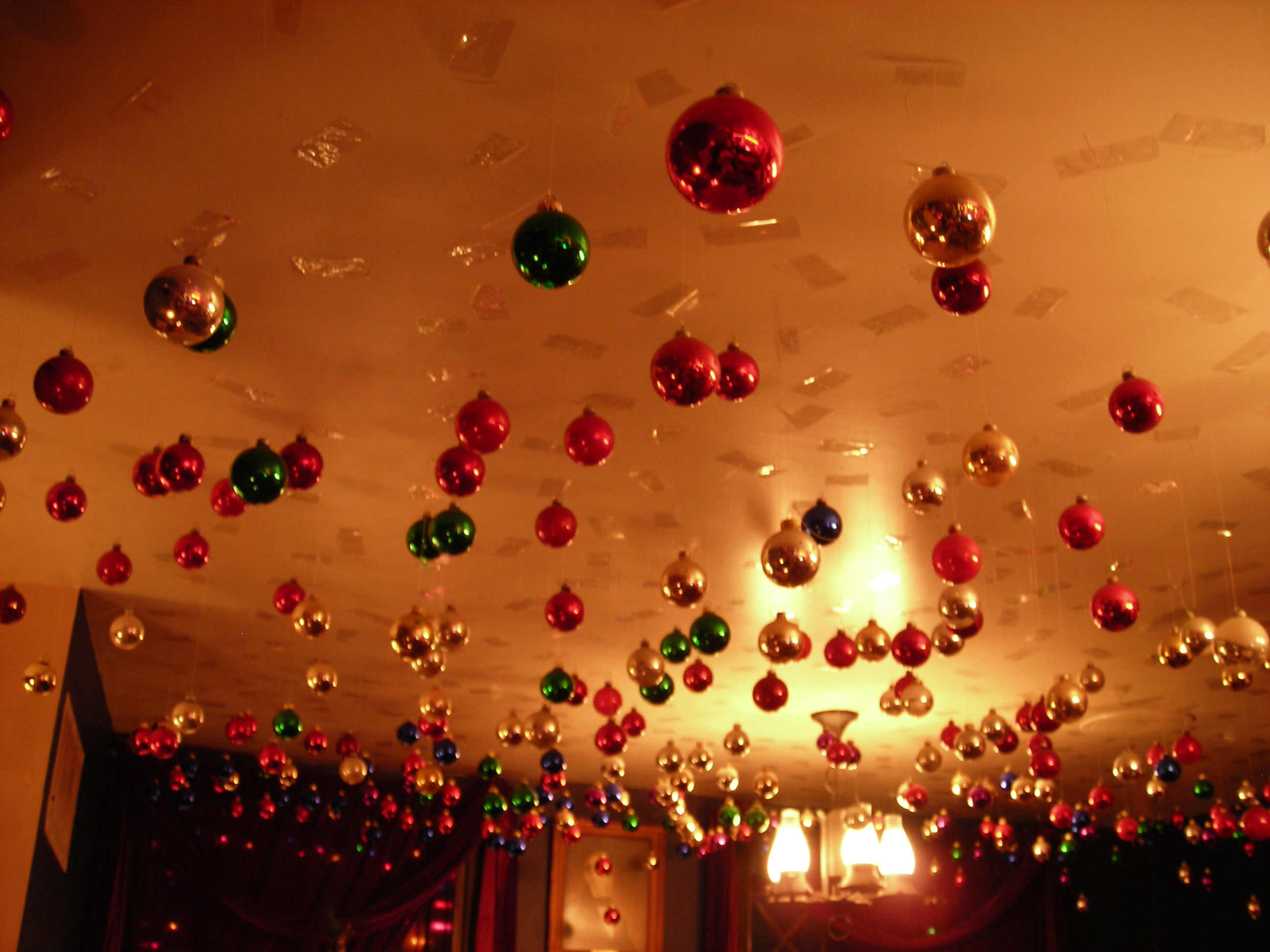 En esta imagen vemos la parte superior de una sala y en el techo hay varias bolas navideñas de diversos colores pegadas con cinta, predominan los colores rojos, verdes y dorados