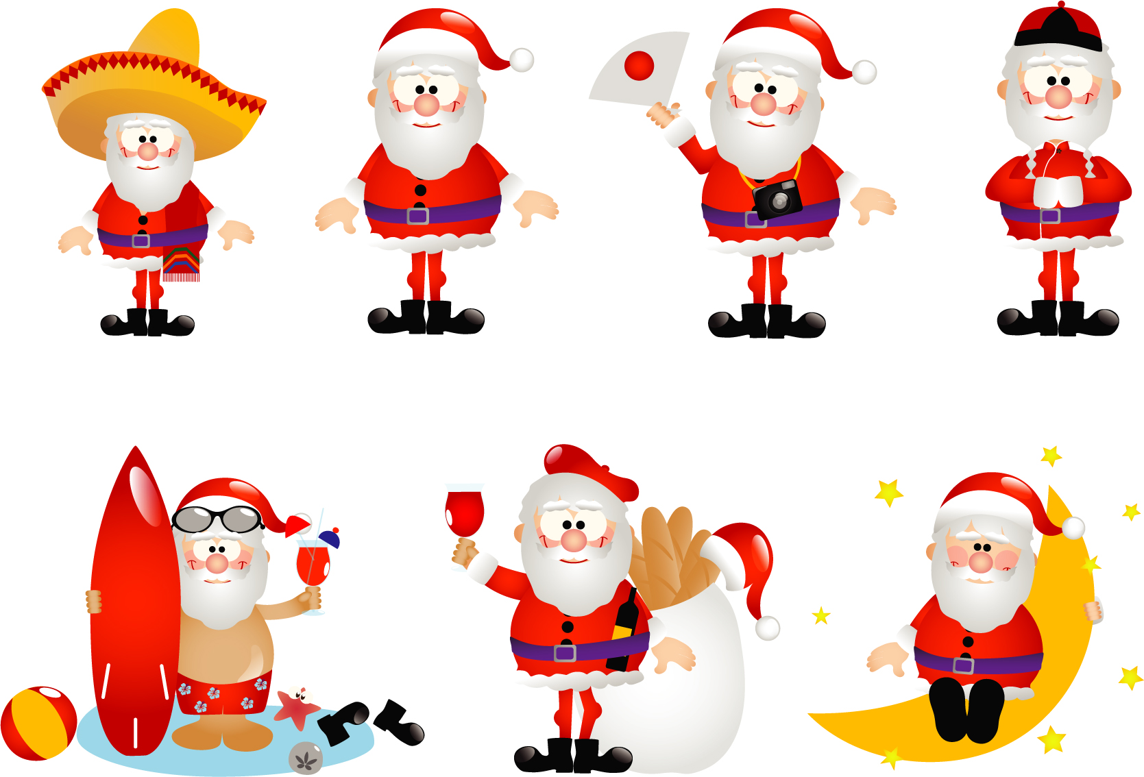 En esta imagen podemos apreciar el fondo blanco y papa noel en varias facetas, con sombrero, con gorro,surfista,con panes y en la media luna