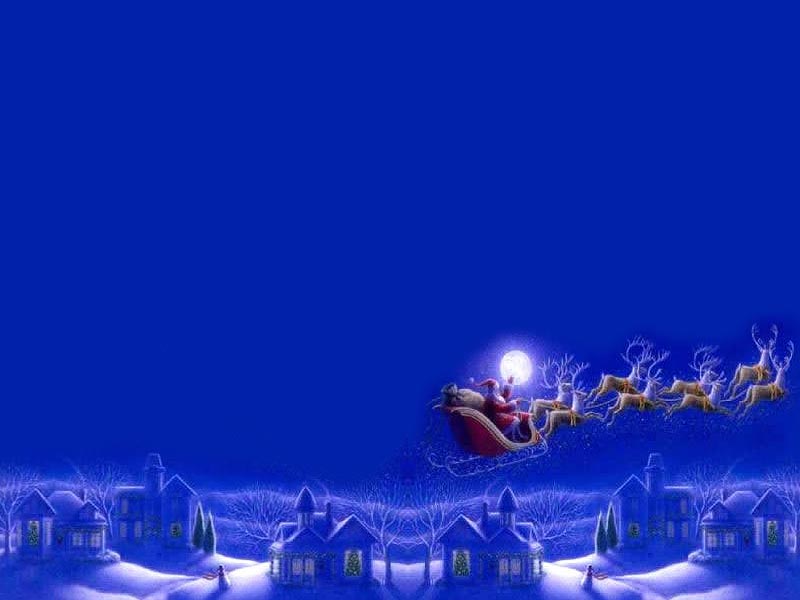 Esta imagen podemos ver un fondo azul, se ve la luna llena y muy cerca esta pasando papanoel con su trineo volando, lleva 8 renos y en la parte inferios una ciudad