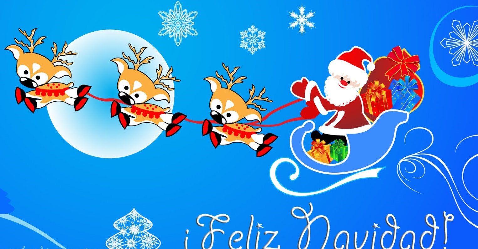 Esta imagen podemos observar un fondo celeste con copos de nieve y adcon la frase de Feliz Navidad, se ve a papanoel y a los renos en caricatura