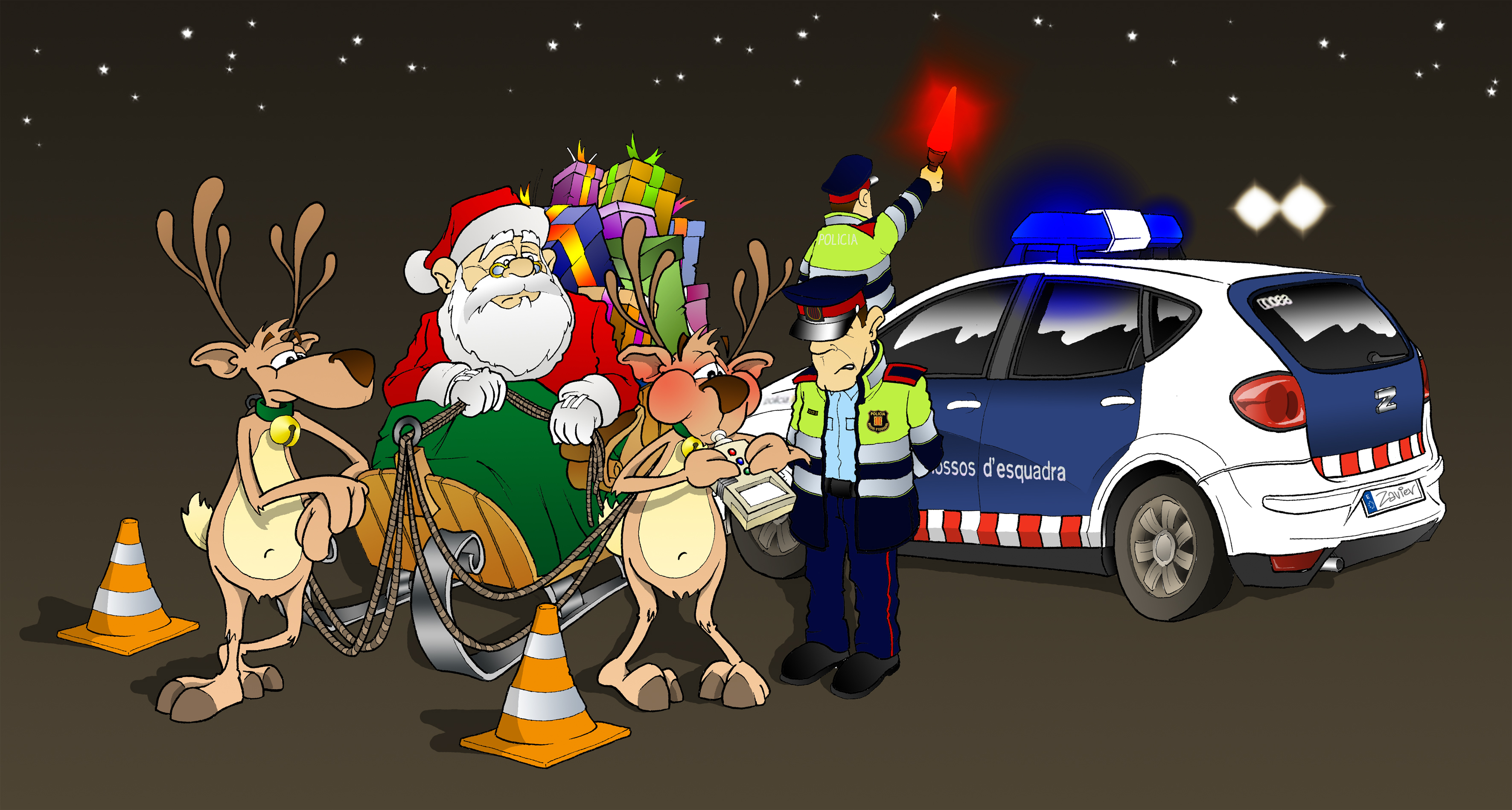 Esta imagen muestra a papanoel que es detenido por la policía cuando iba con sus renos cargados de regalos, le están haciendo la prueba de la alcoholemia