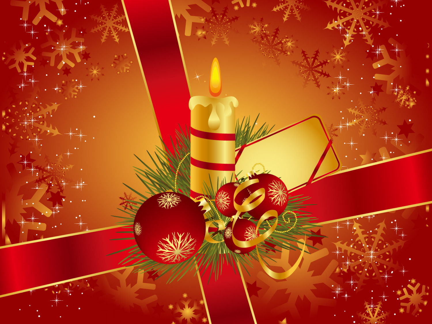 En esta imagen vemos un fondo navideño con copos de nieve, el borde es rojo y el centro naranja, hay una cinta que cruza los extremos y bolas naiveñas con una vela encendida