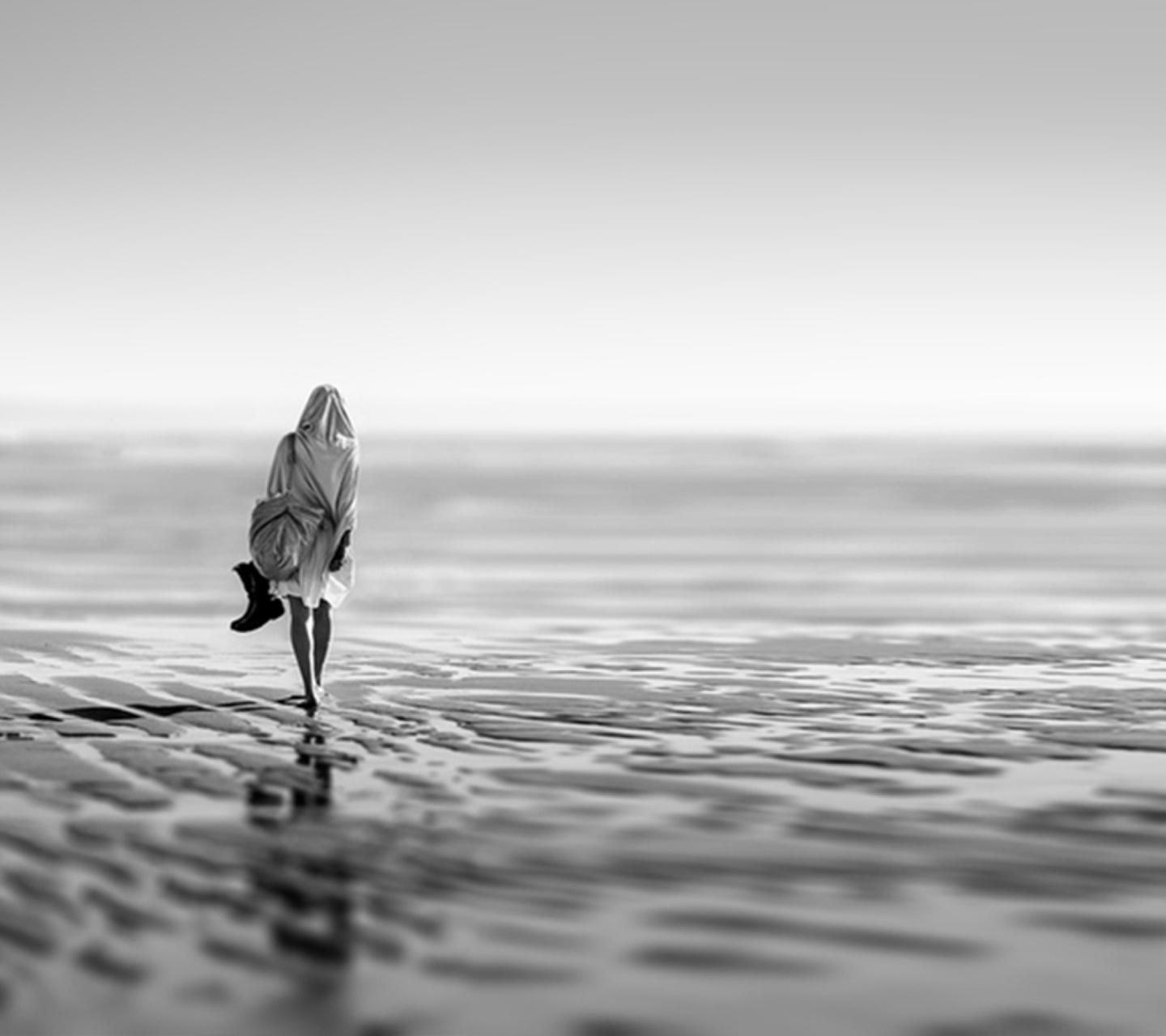 Good Bye En esta imagen podemos ver un fondo gris pero un poco difuminada la imagen, se ve una orilla arenosa y una mujer caminando descalza
