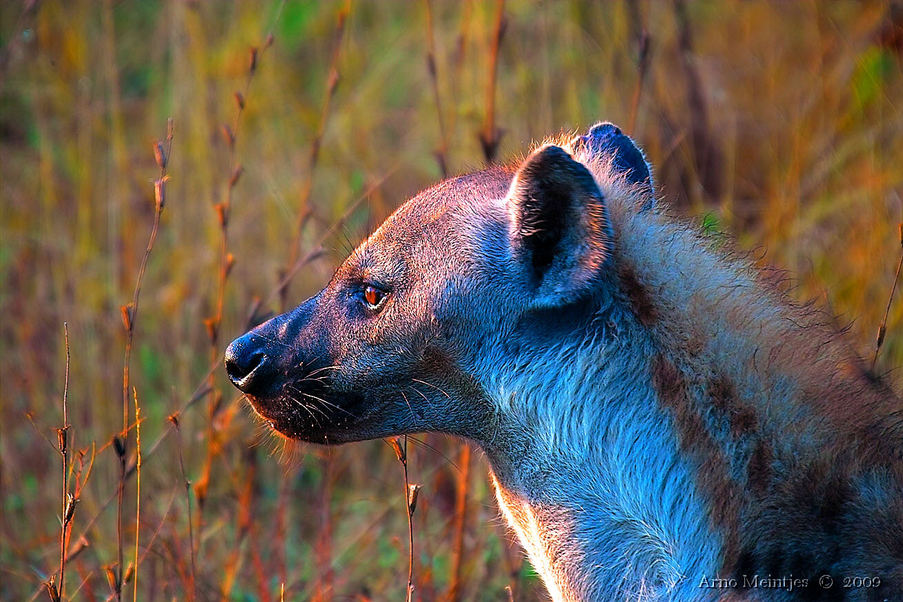 Esta imagen presenta un impresionante retrato de una hiena en su hábitat natural, capturada al atardecer. Los tonos cálidos y dorados del fondo se mezclan armoniosamente con los fríos y azulados que iluminan el pelaje de la hiena, creando un contraste visual cautivador. La luz del sol acaricia suavemente la cara del animal, resaltando cada detalle de su expresión atenta y contemplativa. Ideal para quienes buscan fondos de pantalla únicos y con un toque salvaje, esta imagen de hiena es perfecta para decorar pantallas de computadoras o teléfonos móviles. Las texturas naturales de las plantas en el fondo añaden profundidad a la composición, mientras que el enfoque nítido en los ojos del animal aporta una sensación de conexión con la naturaleza, ideal para quienes disfrutan de lo exótico y quieren llevar un pedazo de la vida salvaje a su espacio personal. El uso de este wallpaper no solo transformará el aspecto de cualquier pantalla, sino que también brindará un momento de reflexión y admiración por la belleza de lo natural. Perfecto para amantes de la fauna, fotógrafos y cualquier persona que desee un fondo de pantalla que evoque una sensación de aventura y exploración. Esta imagen, disponible para descargar, ofrece una combinación perfecta entre estética y naturaleza, asegurando que tu fondo de pantalla destaque y se convierta en un punto de conversación para quienes lo vean.