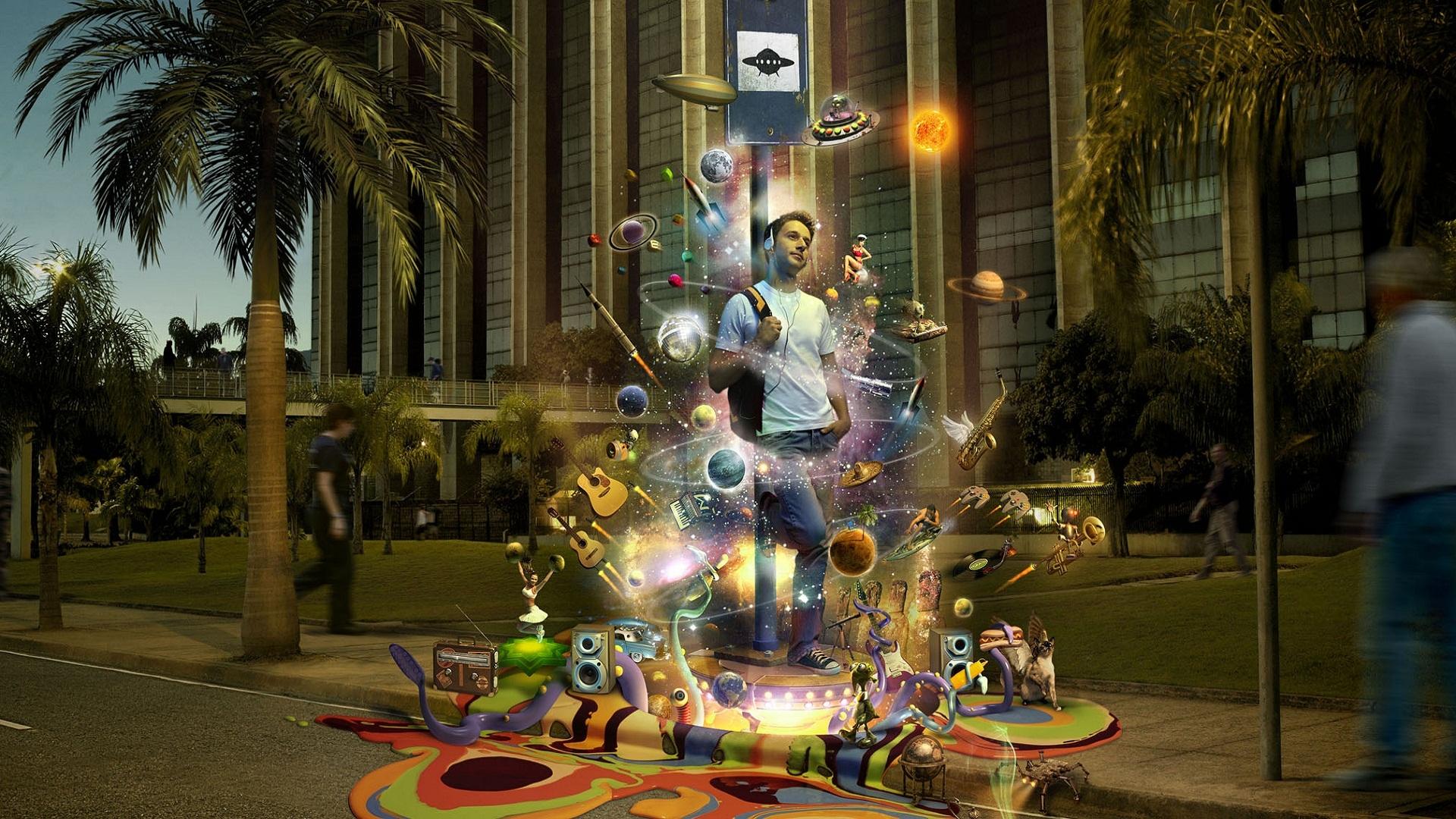 My world, En esta imagen podemos observar a un joven con audifunos que está con varios accesorios volando a su alrededor, como trompeta, guitarra, gato y parlantes