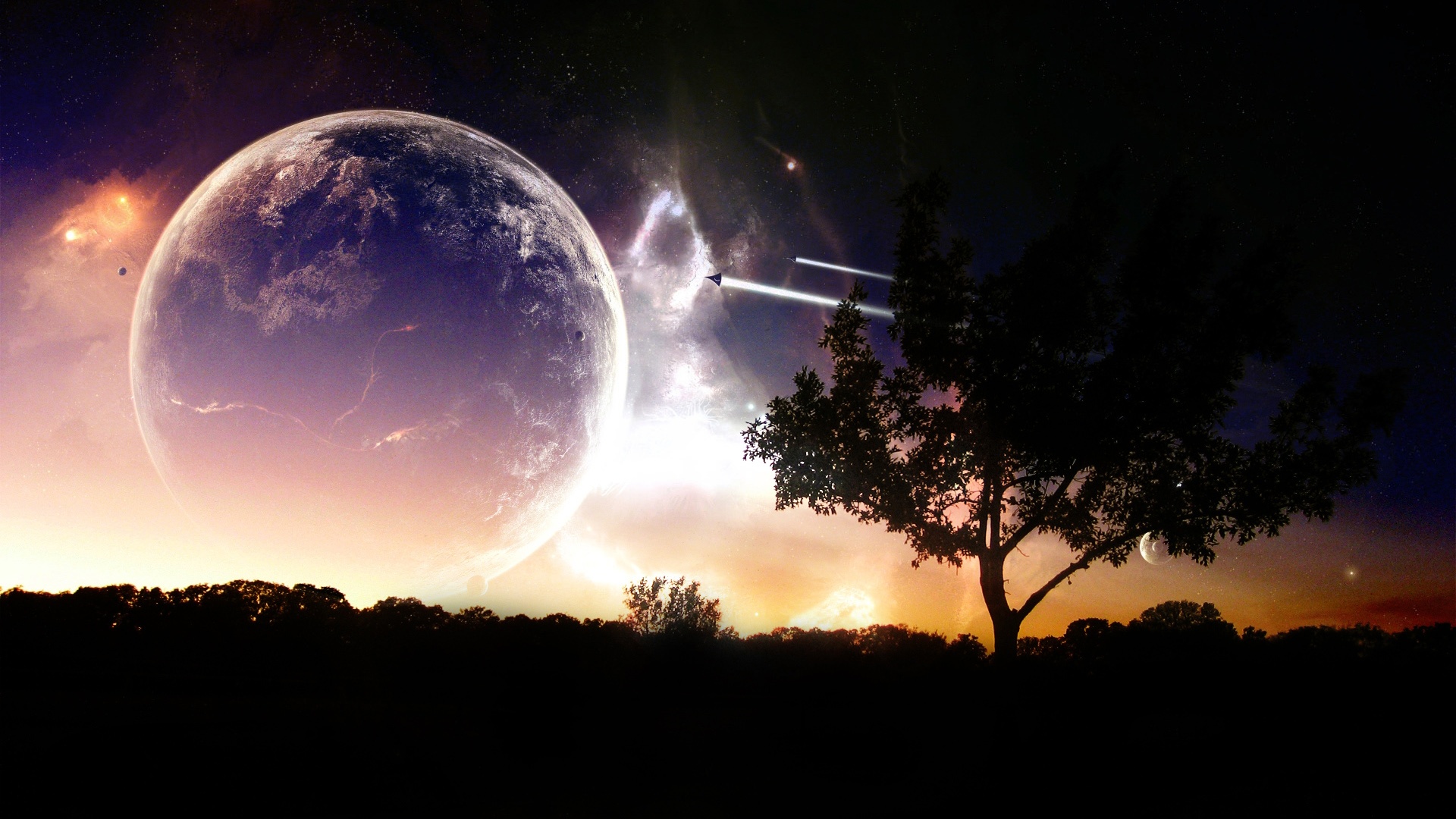 Universe voyage Esta imagen es de ciencia ficción donde podemos ver un árbol y el mundo en el anochecer se ven pequeños dardos impactando predomina el color negro